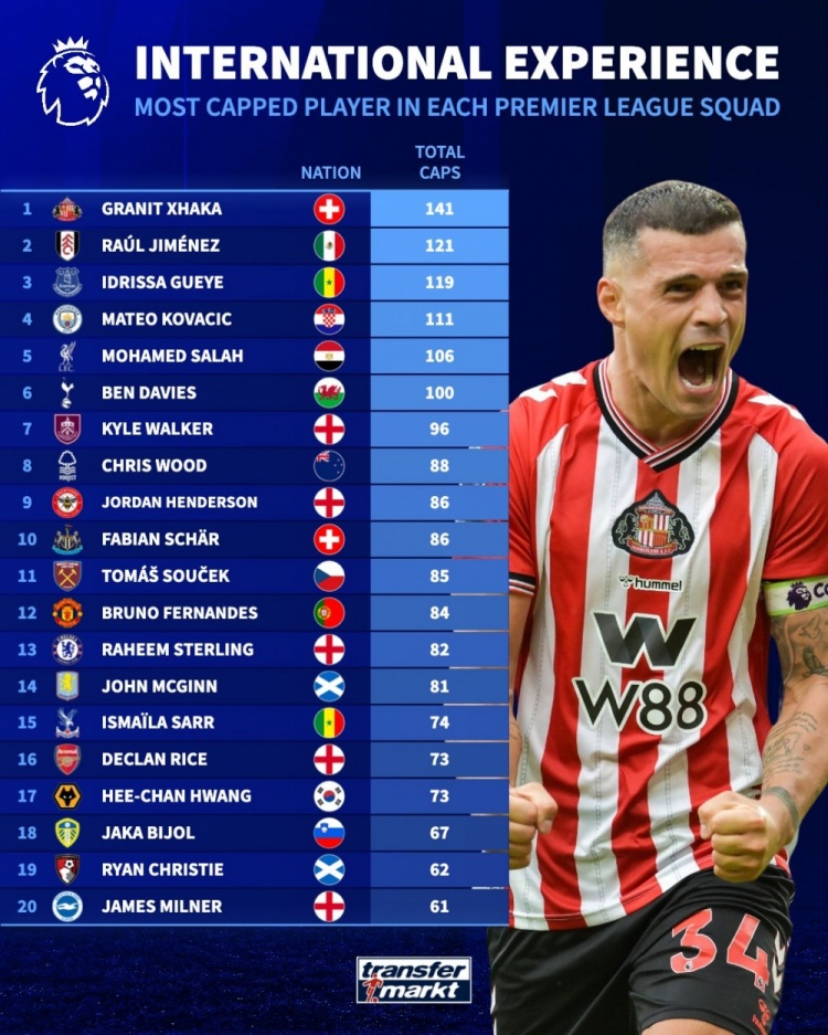 11月1日讯 英超20支球队有着诸多国脚球员,德国转会市场盘点了各队为国家队出战场次最多球员,扎卡以141场居首,希门尼斯以121场位居次席。