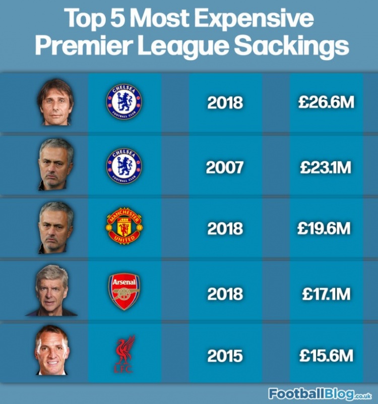 就个人而言,穆里尼奥是让前东家们“钱包大出血”最多的主教练。他在英超的四次被解雇(两次在切尔西,一次在曼联,一次在热刺)总共让这三家俱乐部花费了6200万英镑。其中,曼联在2018年为解雇他支付了1960万英镑,而切尔西在2007年首次与他分手时花费了2310万英镑。